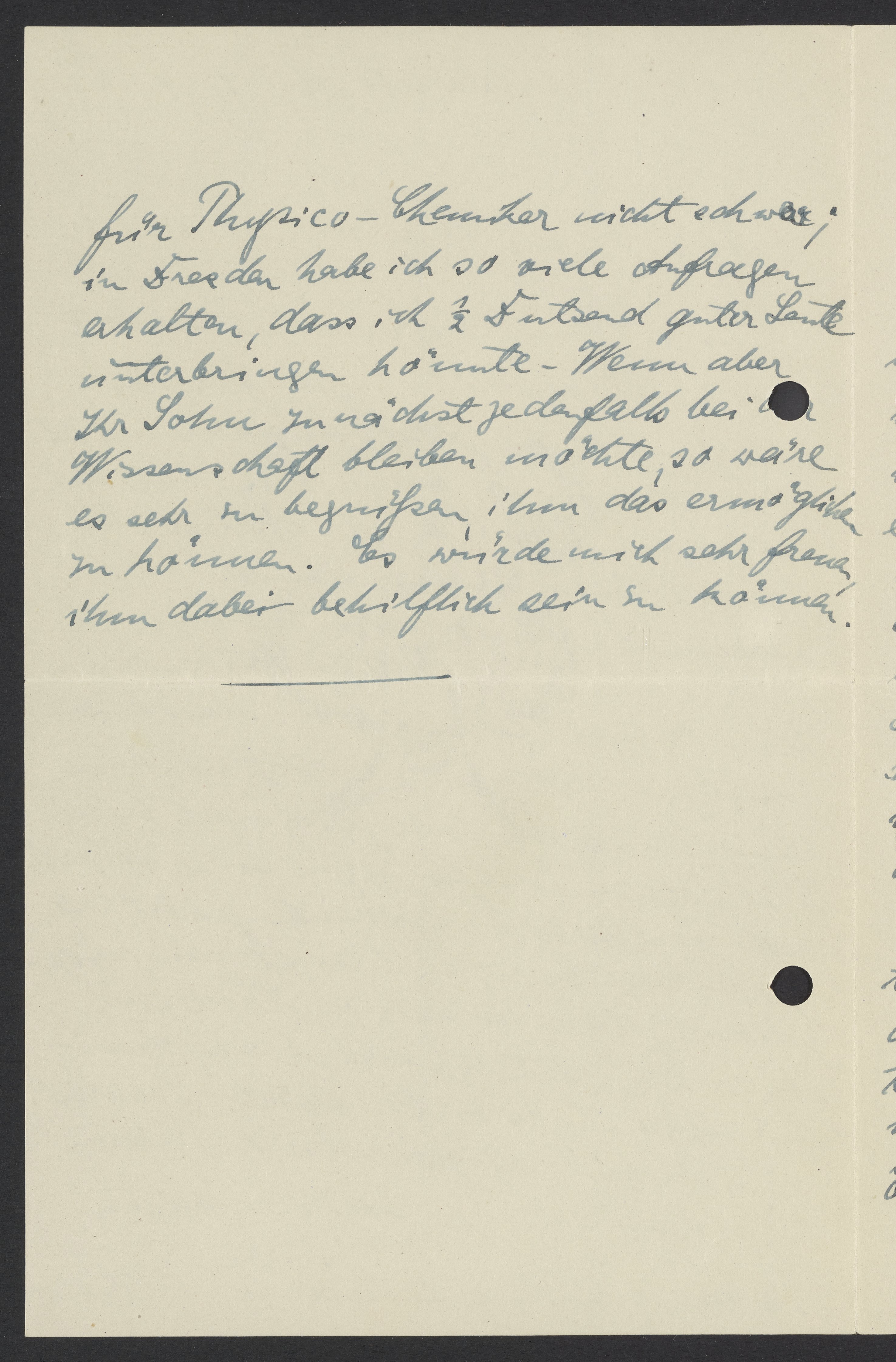 Physico-Chemiker nicht etwas; in Dresden habe ich so viele Anfragen erhalten, dass ½ Dutzend guter Leute unterbringen könnte. Wenn aber Ihr Sohn zunächst jedenfalls bei der Wissenschaft bleiben möchte, so wäre es sehr zu begrüßen, ihm das ermöglichen zu können. Es würde mich sehr erfreuen, ihm dabei behilflich zu sein.