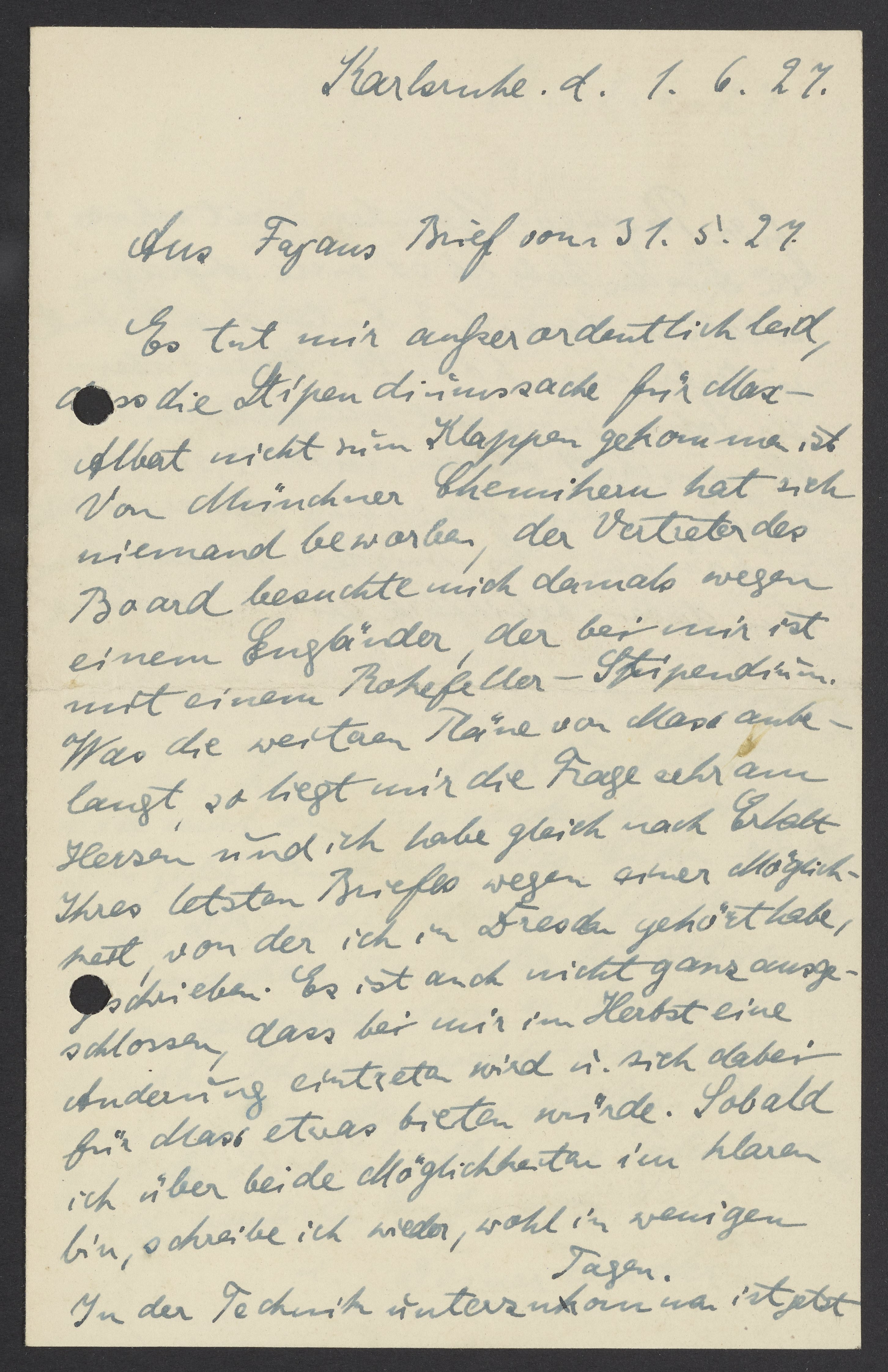 Es tut mir leid außerordentlich Leid, dass die Stipedienssache für Max-Albert nicht zum Klappen gekommen ist. Von Münchener Chemikern hat sich niemand beworben, der Vertreter des Board besuchte mich damals wegen einem Engländer, der bei mir ist mit einem Rockefeller-Stipendium. Was die weiteren Träume von Max anbelangt, so liegt mir die Frage sehr am Herzen und ich habe gleich nach Erhalt Ihres letzten Briefes wegen einer Möglichkeit, von der ich in Dresden gehört habe, geschrieben. Es ist nicht ganz ausgeschlossen, dass bei mir im Herbst eine Änderung eintreten wird u. sich dabei für Max etwas bieten würde. Sobald ich über beide Möglichkeiten im Klaren bin, schreibe ich wieder, wohl in wenigen Tagen. In den Technikunternehmen ist für