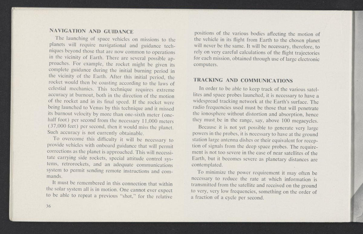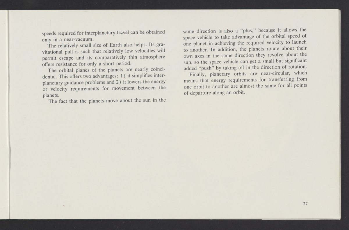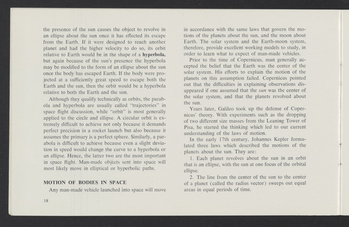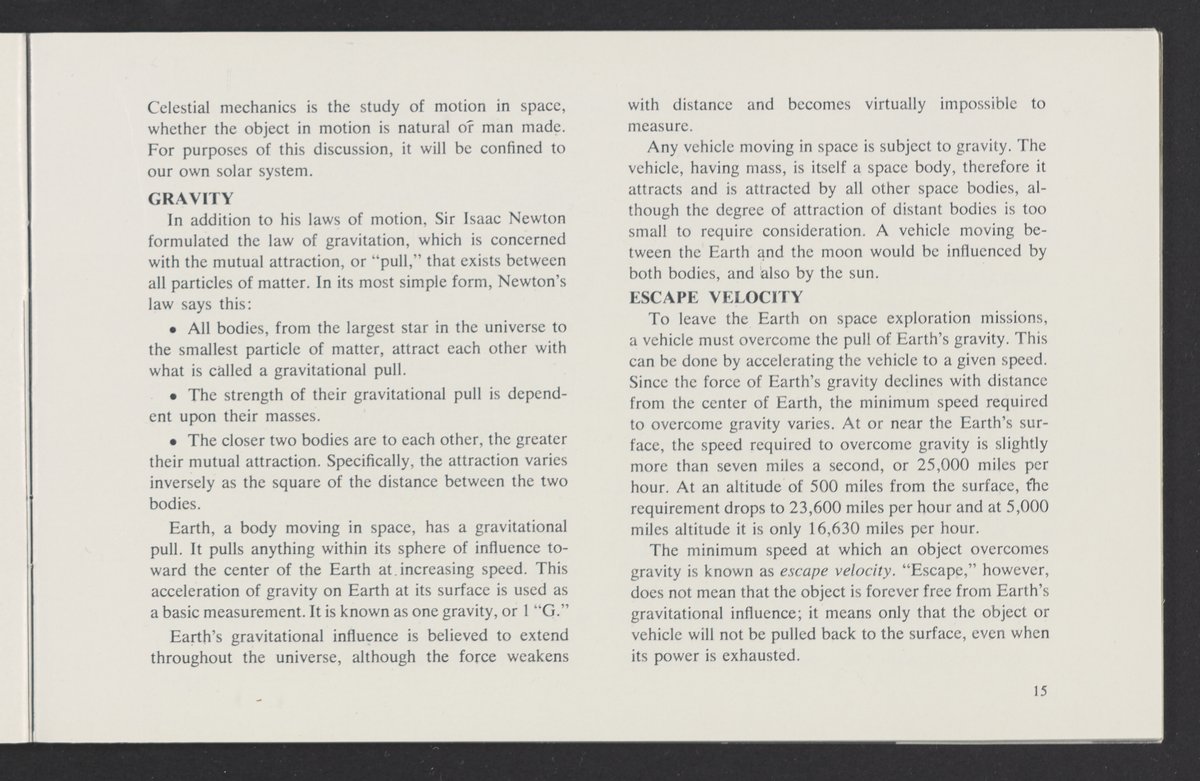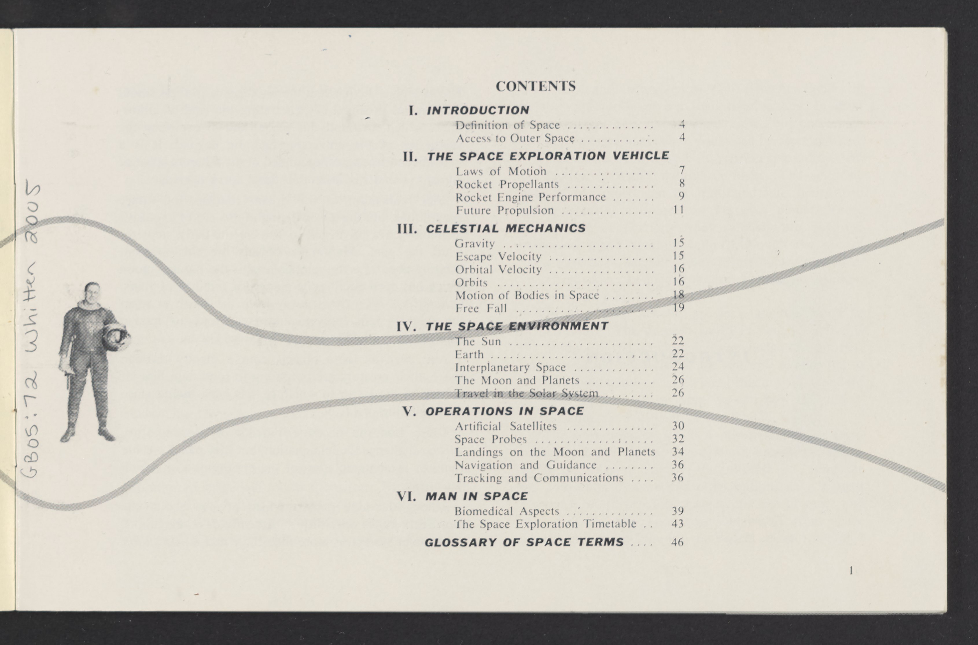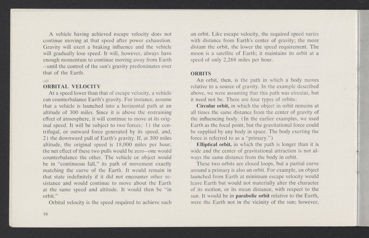 Small JPG1200 x 784px — 110 KBLarge JPG2880 x 1881px — 510 KBFull-sized JPG3458 x 2258px — 687 KBOriginal fileTIFF — 3458 x 2258px — 22.4 MBAn informational booklet containing a technical introduction to space exploration. Includes six chapters outlining various aspects of space travel such as celestial mechanics and the logistics of transporting humans in space. A glossary of terms is found at the end of the pamphlet, and a variety of printed illustrations and diagrams are included in each chapter. The publication is digitized in its entirety.