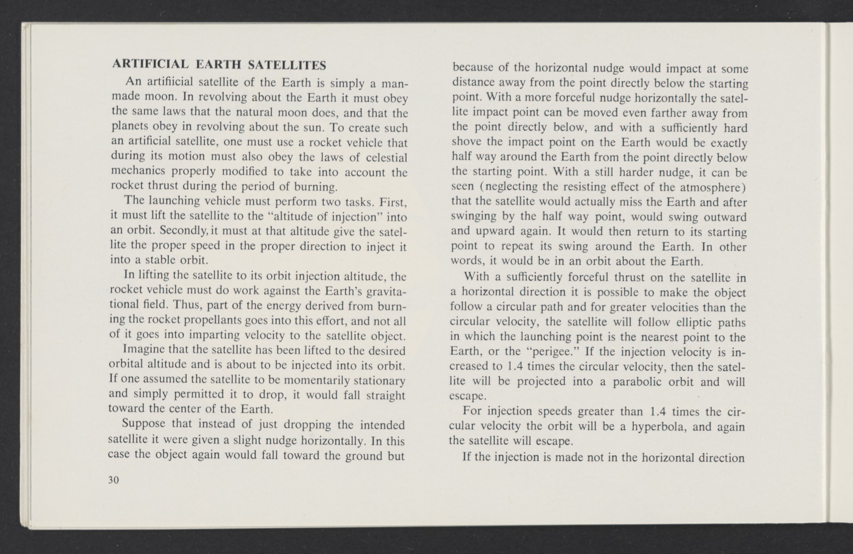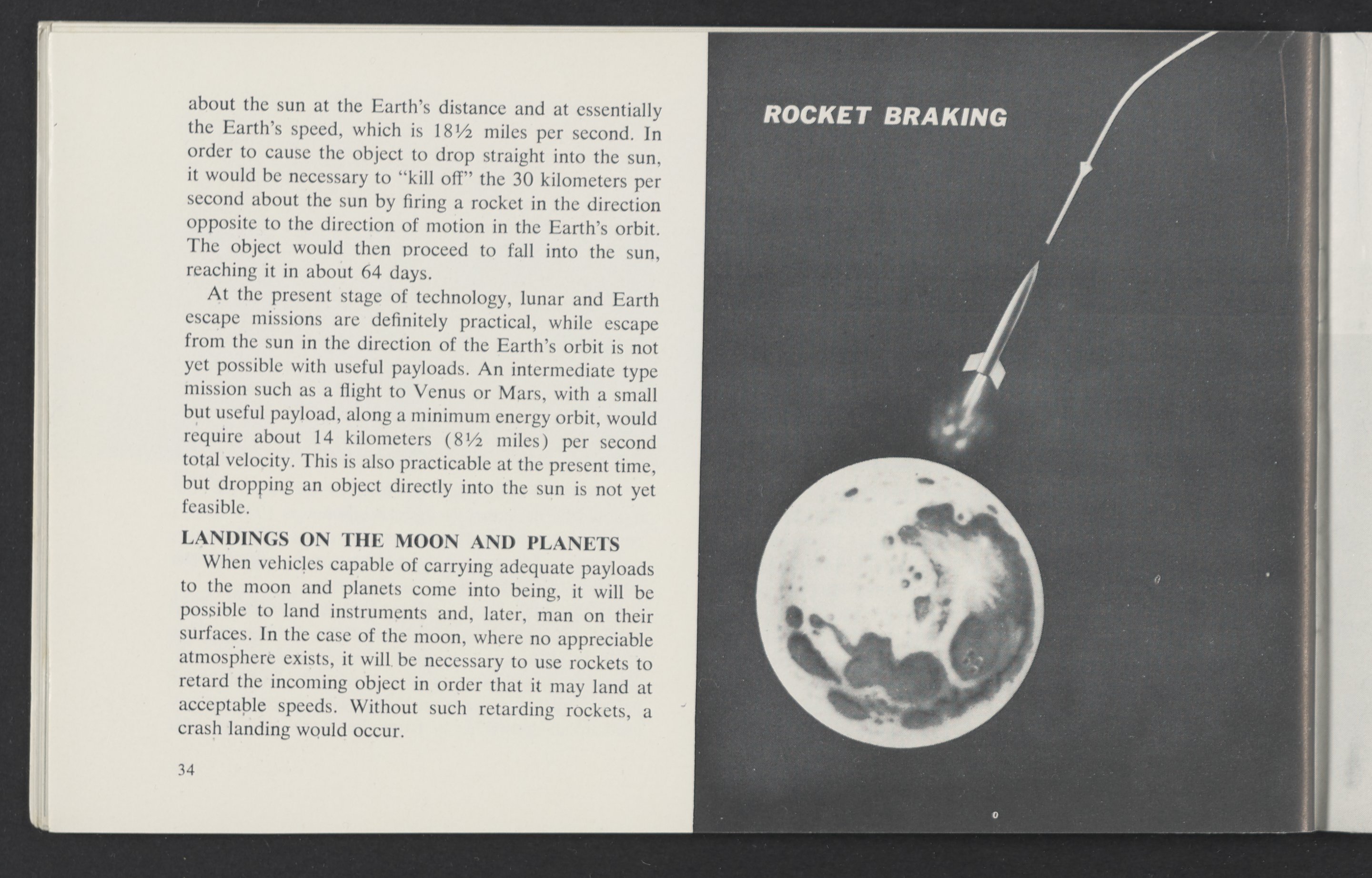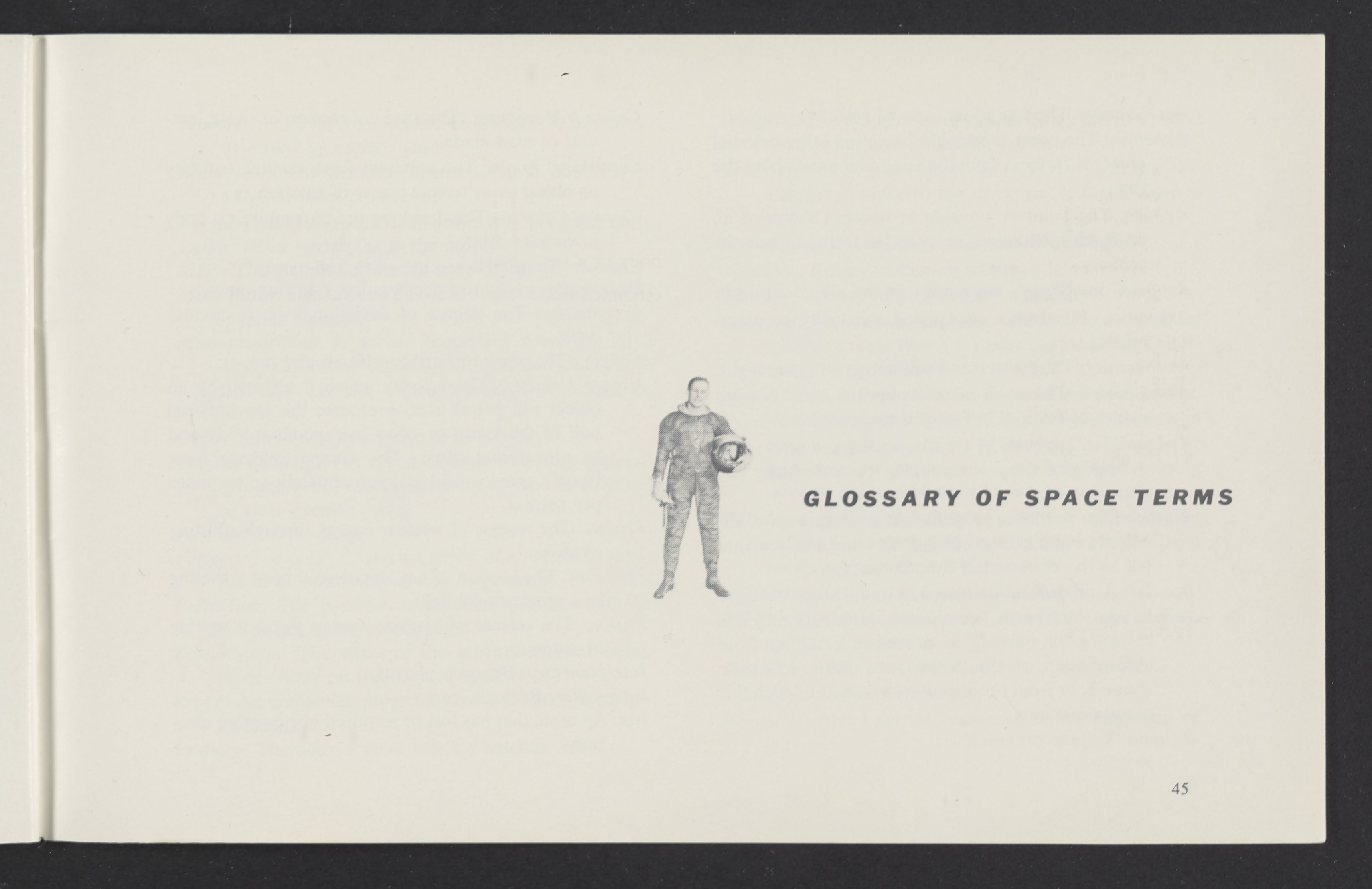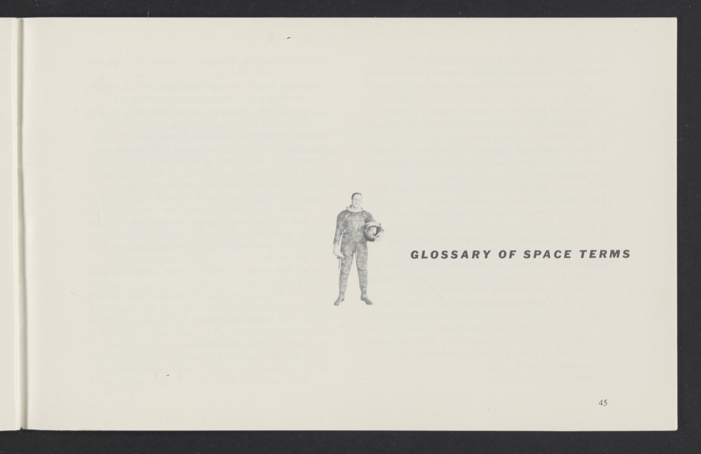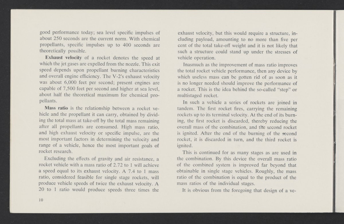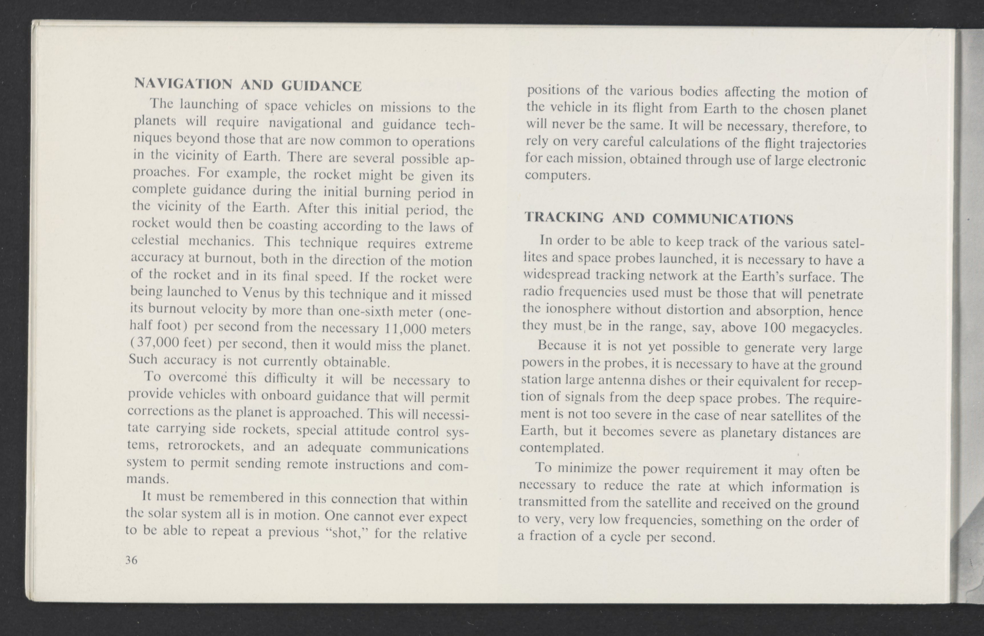 Small JPG1200 x 784px — 110 KBLarge JPG2880 x 1881px — 510 KBFull-sized JPG3458 x 2258px — 687 KBOriginal fileTIFF — 3458 x 2258px — 22.4 MBAn informational booklet containing a technical introduction to space exploration. Includes six chapters outlining various aspects of space travel such as celestial mechanics and the logistics of transporting humans in space. A glossary of terms is found at the end of the pamphlet, and a variety of printed illustrations and diagrams are included in each chapter. The publication is digitized in its entirety.