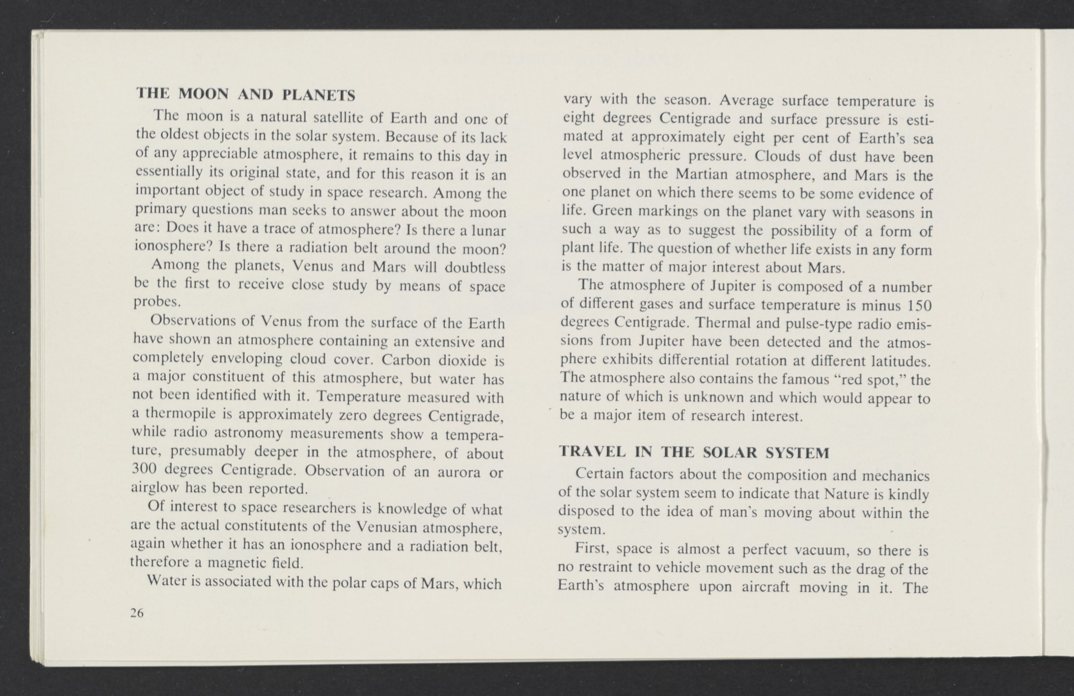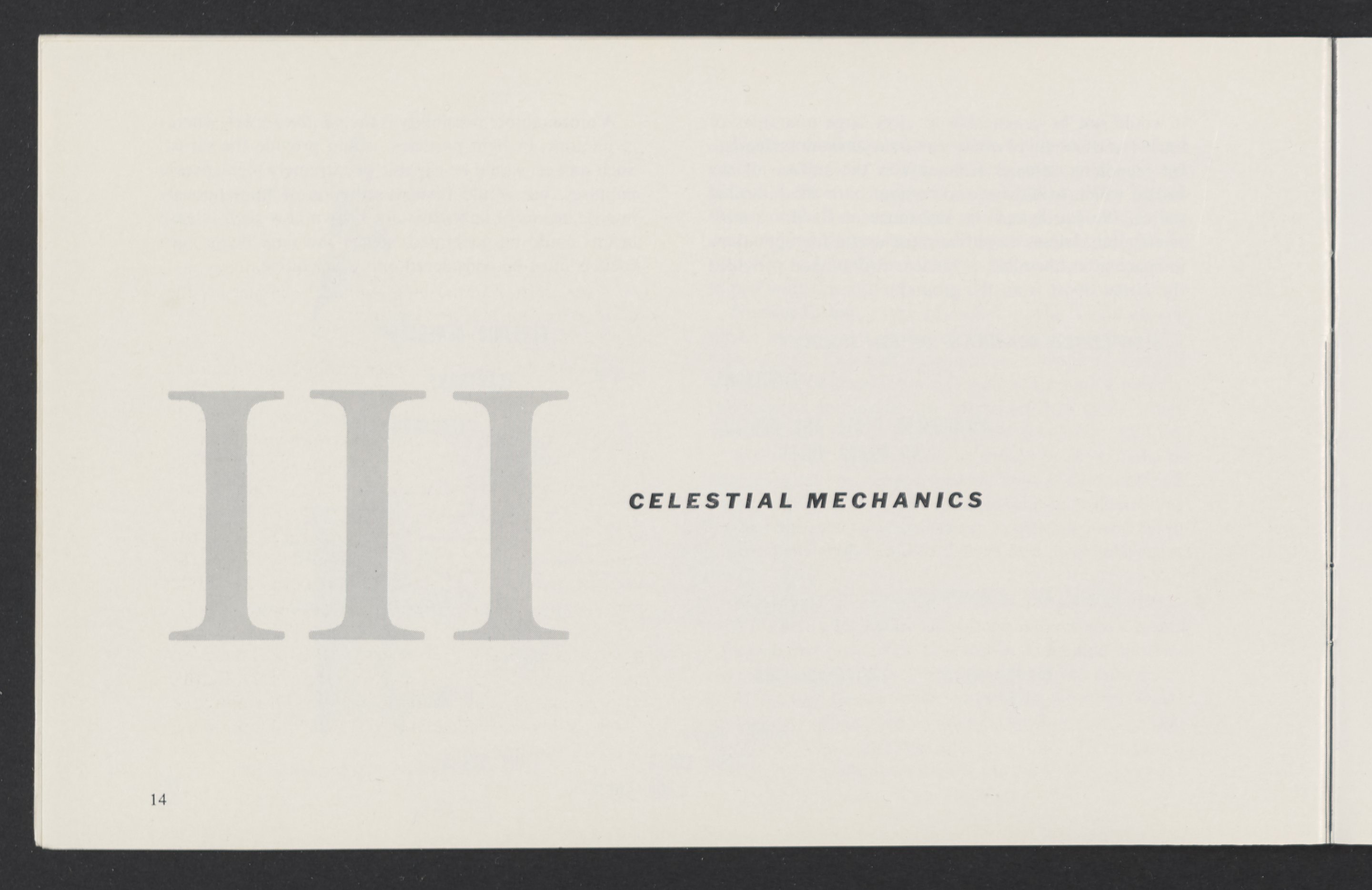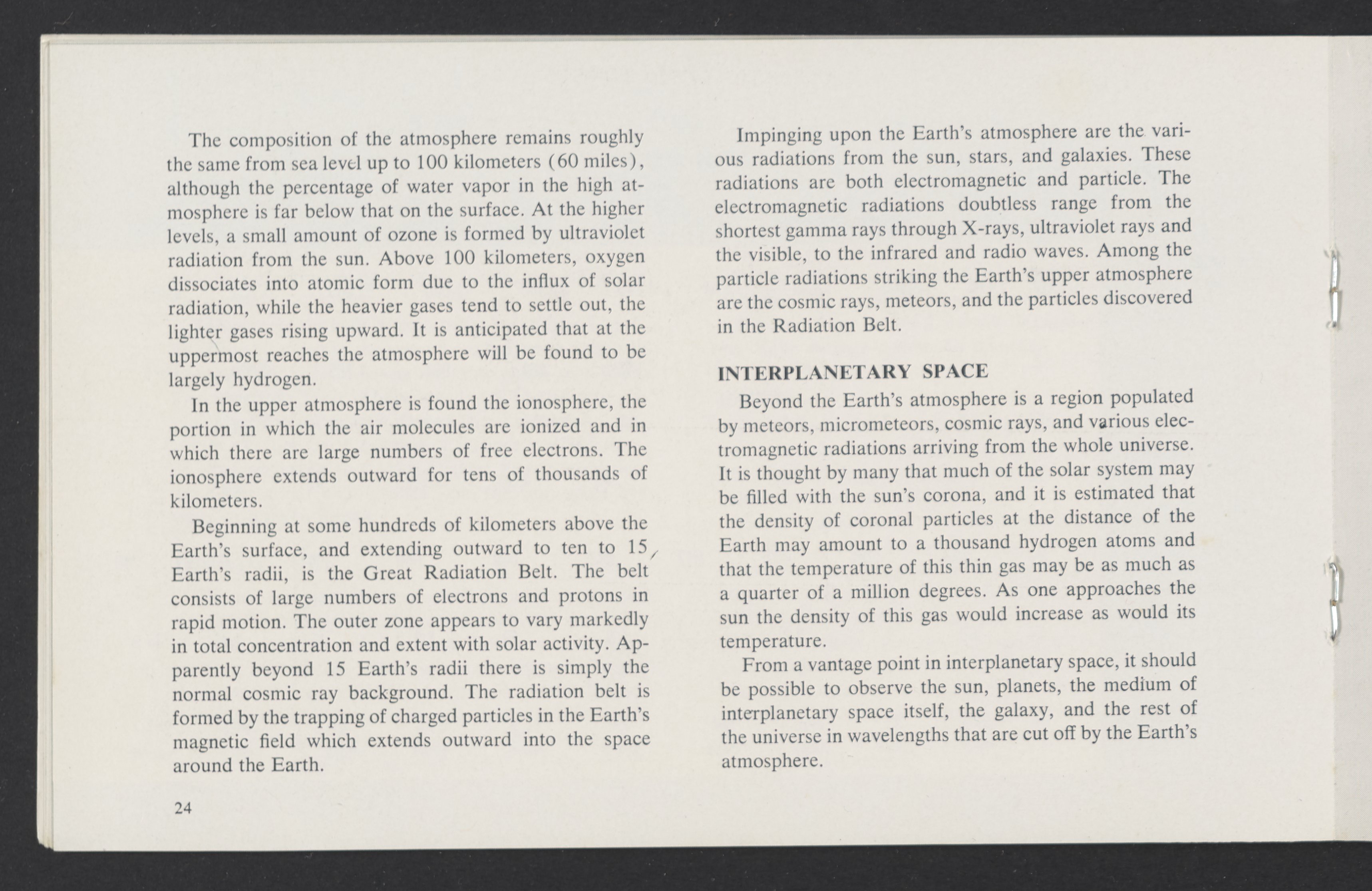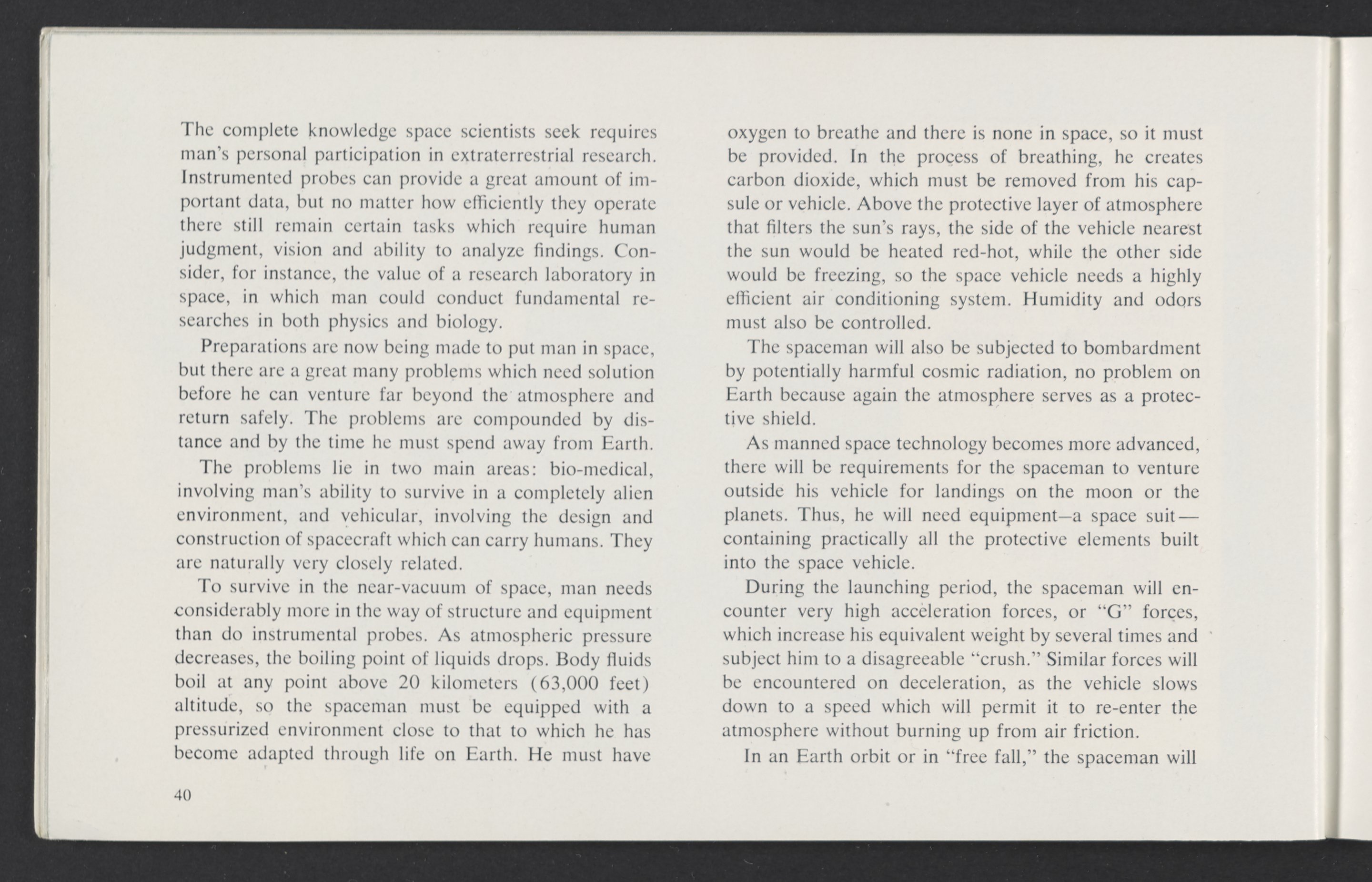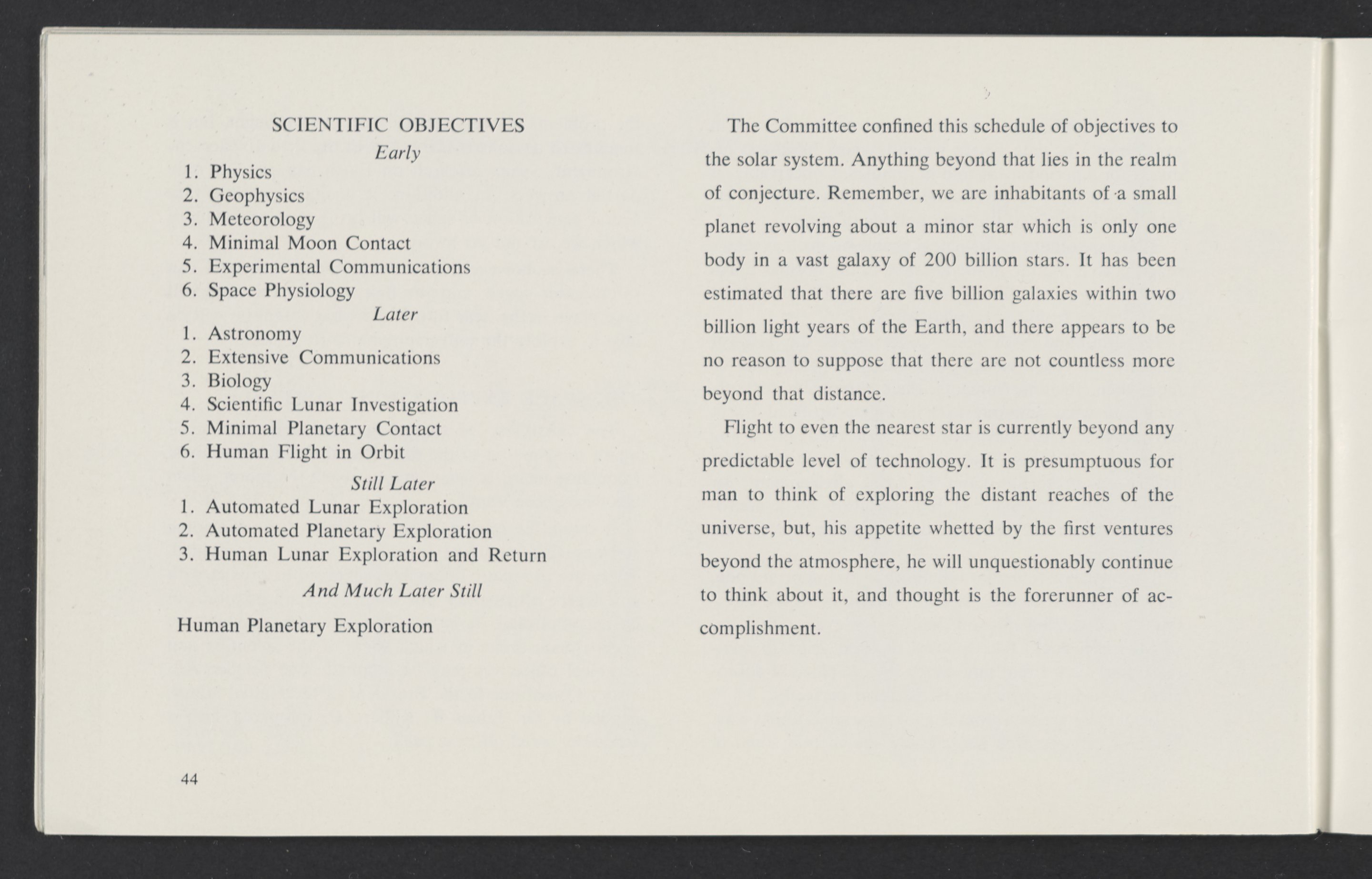 Small JPG1200 x 784px — 110 KBLarge JPG2880 x 1881px — 510 KBFull-sized JPG3458 x 2258px — 687 KBOriginal fileTIFF — 3458 x 2258px — 22.4 MBAn informational booklet containing a technical introduction to space exploration. Includes six chapters outlining various aspects of space travel such as celestial mechanics and the logistics of transporting humans in space. A glossary of terms is found at the end of the pamphlet, and a variety of printed illustrations and diagrams are included in each chapter. The publication is digitized in its entirety.
